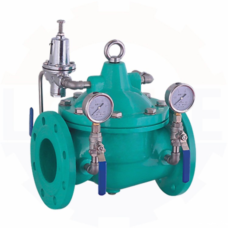 当阀门出口压力降到导阀弹簧设定压力时,导阀开启,控制室向下游排水。由于导阀系统排水量大于针阀的进水量,主阀控制室压力下降。进口压力使主阀开启。在稳定状态下,控制室进水、排水相同,主阀开度不变,出口压力稳定。