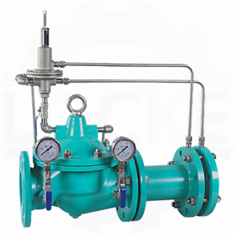 当阀门从进口端给水时,水流过针阀进入主阀控制室,并经过导阀、球阀流出主阀控制室到出口,此时主阀处于全开或浮动状态。调定主阀上部的流量调节阀,可为主阀设定一定开度。调节针阀开度和调节导阀弹簧压力,即可使主阀开度保持在设定开度,并在压力变化时导阀进行自动调节,保持流量不变。