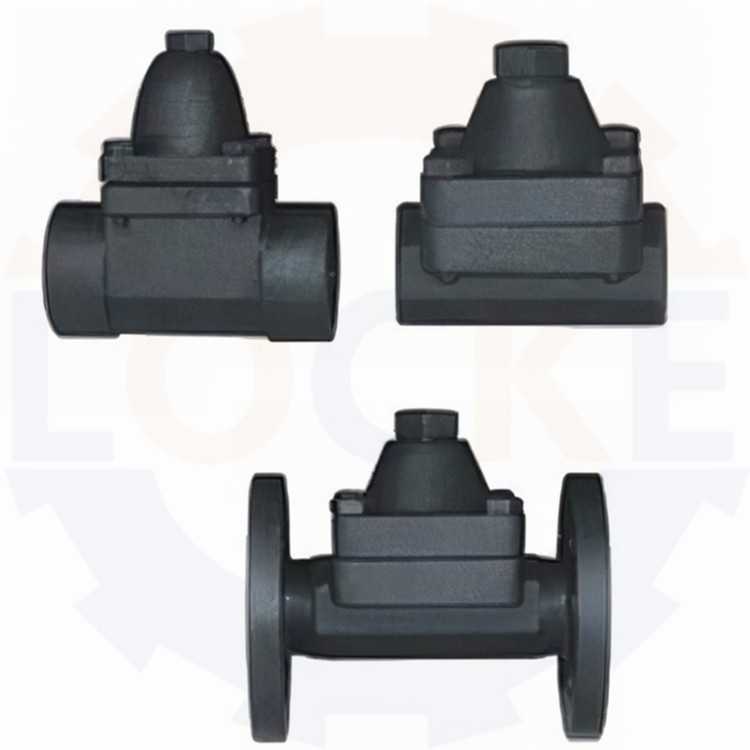 德国《LOCKE》洛克--进口双金属片式疏水阀是由双金属片感温元件带动阀心进行开关阀门。当装置刚起动时,管道出现低温冷凝水,双金属片是平展的,阀芯在弹簧的弹力下处于开启位置。当冷凝水温度渐渐升高,双金属片感温元件开始弯曲变形,并把阀芯推向关闭位置。在冷凝水达到饱和温度之前,疏水阀完全关闭。阀前始终存有高温凝结水,无蒸汽泄漏,节能效果好。